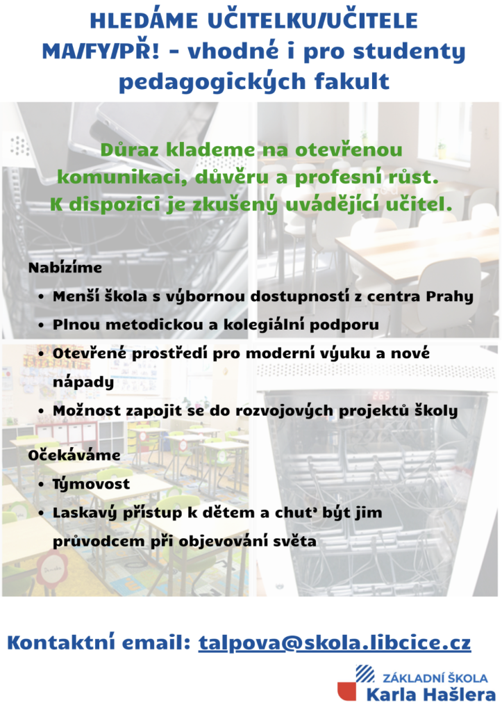 Základní škola Karla Hašlera hledá učitele/ky pro 1. stupeň a pro výuku předmětů - matematika, fyzika, přírodopis a asistenta/tku pedagoga.
