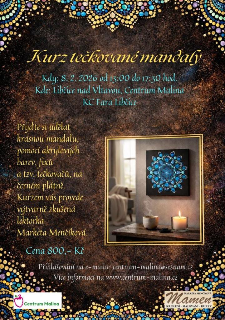 Na tomto kreativním kurzu si vytvoříte originální tečkovanou mandalu na černém plátně o velikosti 30 × 30 cm. Pracovat můžete se šablonami, nebo se nechat vést vlastní fantazií a mandalu si předkreslit podle sebe.